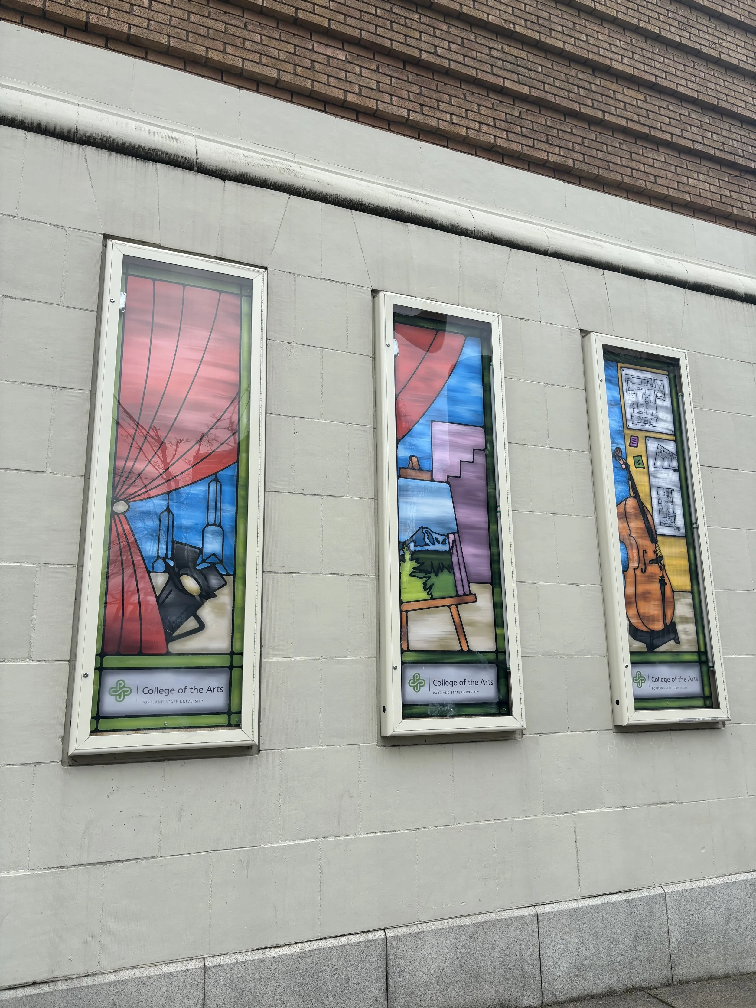 The College of the Arts displays art in three faux windows on the Lincoln Hall building, inspired by each of the four schools of art: architecture, art and design, film, and music. The banners connect the city to the school, and give a sense of what magic happens within each building.